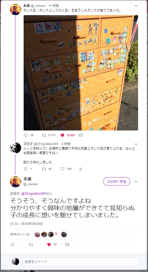 ただ、ツイートの写真をよくよく見てみると、箪笥の下の方にはアンパンマンやドラえもんのシールが、そして上に向かうにしたがって当時流行っていたであろうアニメやゲーム、そして特撮ヒーローへと変わっているのがわかる。